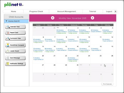 按下圖日曆中的每日內容,您將會看見孩子練習過的數學單元的總結。每日您都能看見: