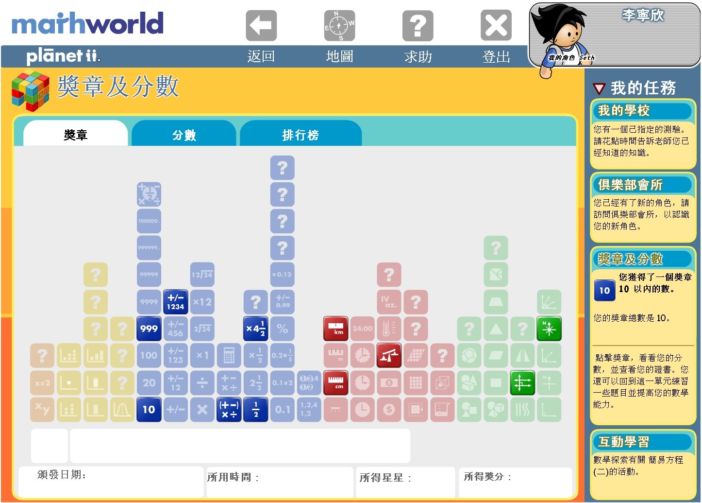 小孩都喜歡收集 MathWorld 的「數學單元獎章」。獎章讓孩子確立學習目標,引發孩子的自學習,增加了同儕間的認同感。每個獎章代表著對一個數學單元的充份掌握,其水平更亦代表達到了 PLANETii 課程所定的標準。